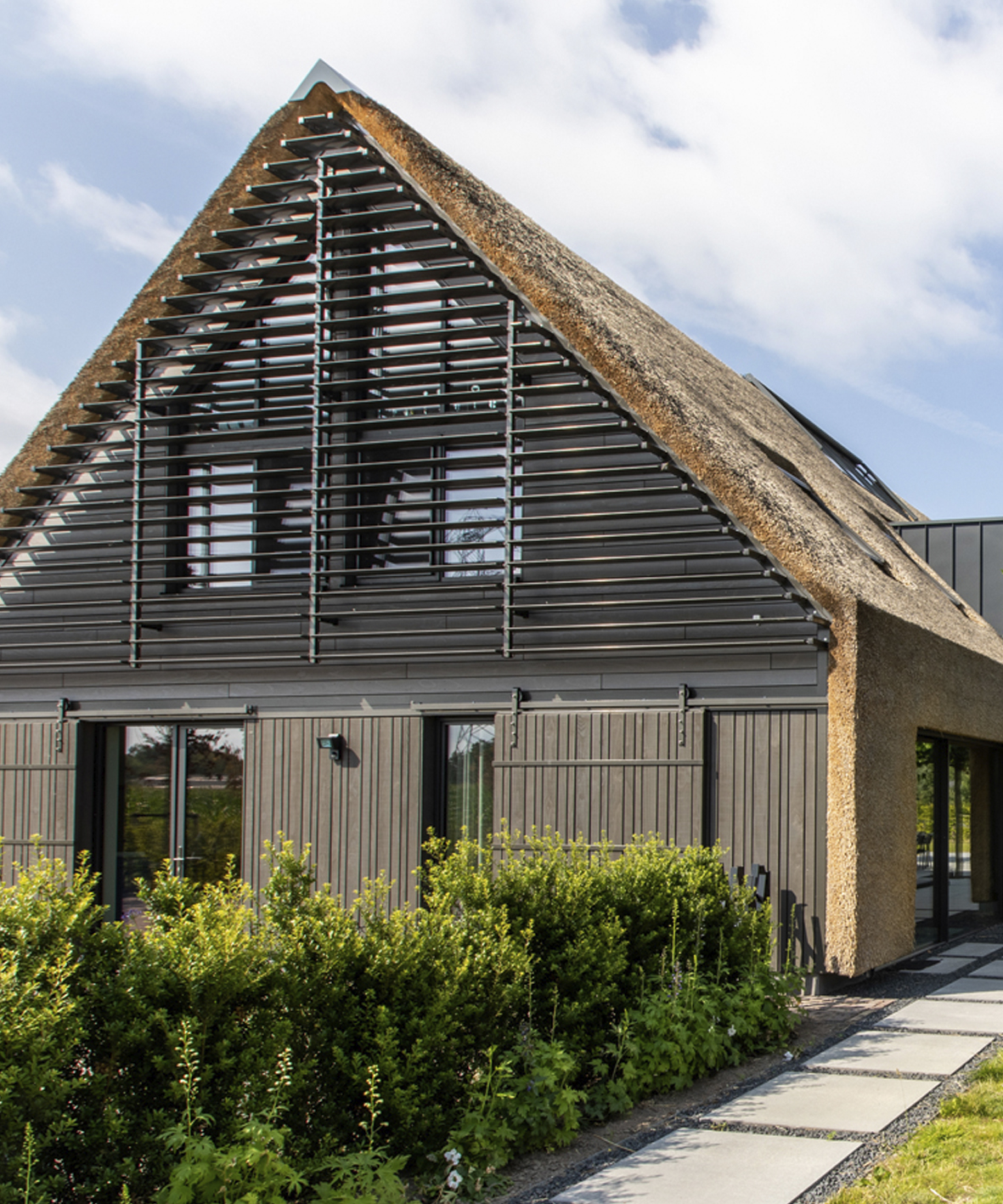 De villa combineert een strakke vormgeving met warme materialen. Er is gekozen voor aluminium kozijnen en louvres als tegenhangers van de houten gevelbekleding en het rieten dak. In de woning een prachtige hoge hal op de verdieping. Bij de hoofdslaapkamer een weelderige kleedkamer en met badruimte ineen. De hoofdslaapkamer heeft een balkon met uitzicht op de prachtige zwemvijver en het omringende landschap. Een wellnessruimte en chillkamer met lichtstraten bevinden zich in de kelder.